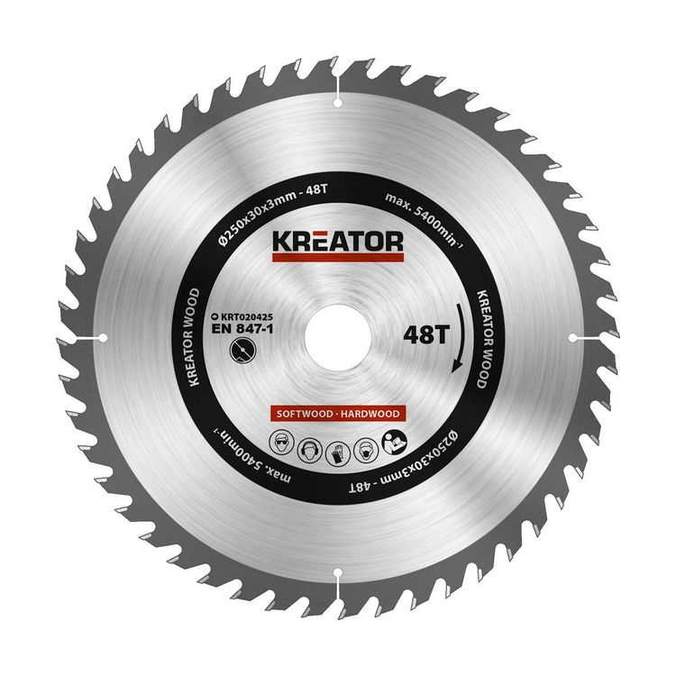 Produit: Lame de scie circulaire Univers: Quincaillerie Diamètre de la lame: 250 mm Épaisseur de la lame: 3 mm Nombre de dents: 48 dents Vitesse de rotation max: 5400 trs/min Marque: Kréator