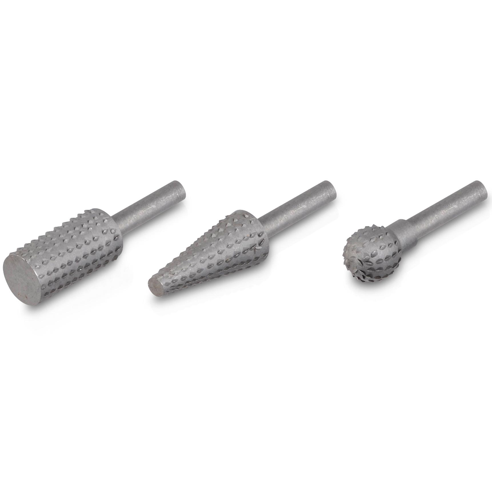 Jeu de 3 râpes à bois Kreator pour perceuse comprenant:1 râpe cylindrique1 râpe conique1 râpe sphériqueDiamètre de l'axe: 6mm