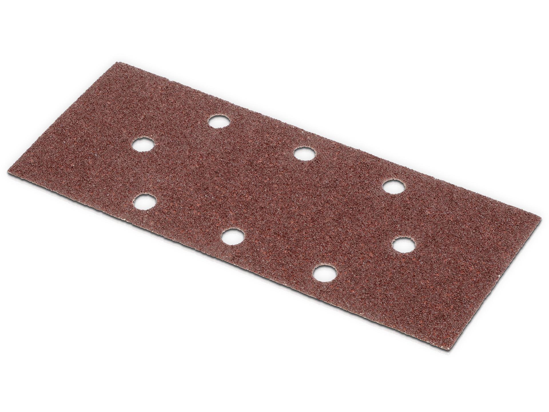 Papier corindon perforé pour ponçage à sec sur la plupart des matériaux.Perforage : 8 trous en oval Fixation : pincesDimensions : 93 x 230 mmGrain : 240