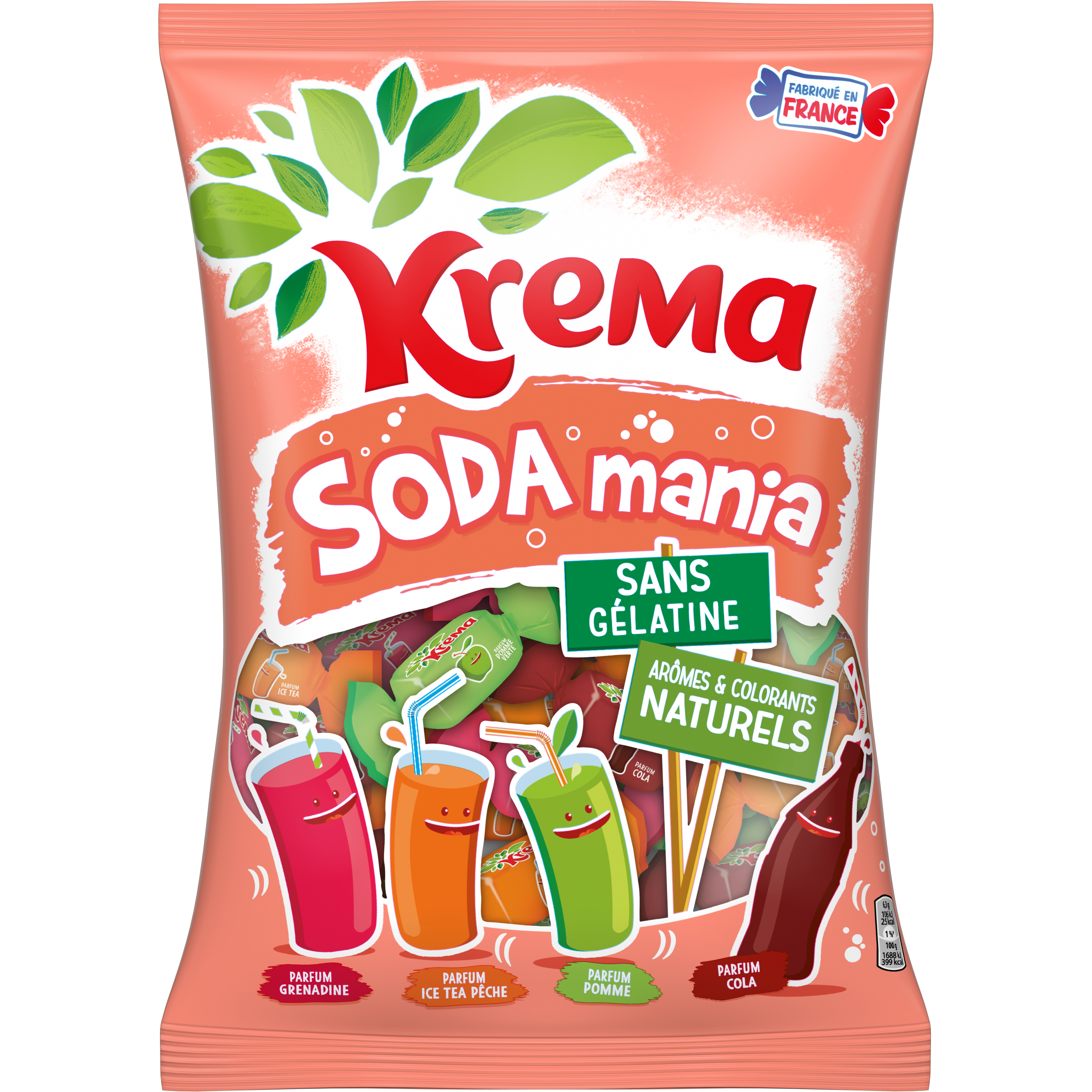 Ingrédients : Sucre, sirop de glucose, huile de palme, amidon de maïs, acidifiant (acide citrique), stabilisant (gomme d'acacia), colorants (caramel ordinaire, chlorophylles, extrait de paprika), arômes naturels, émulsifiants (lécithines), concentré de jus de carotte pourpre.