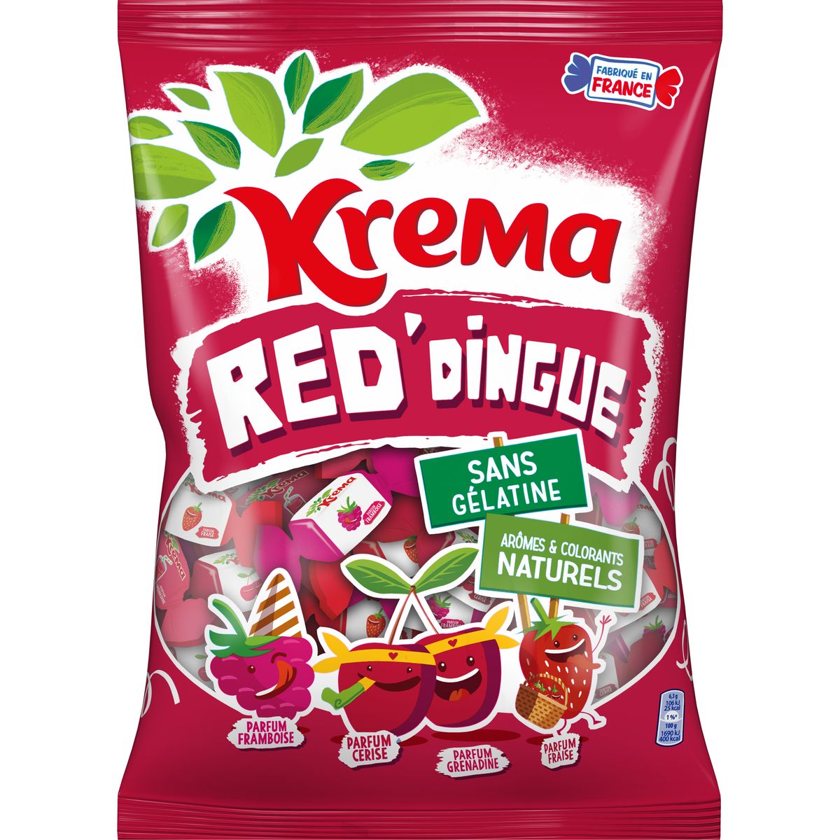 Ingrédients : Sucre, sirop de glucose, huile de palme, amidon de maïs, acidifiant (acide citrique), stabilisant (gomme d'acacia), arômes naturels, colorants (anthocyanes), émulsifiant (lécithines).