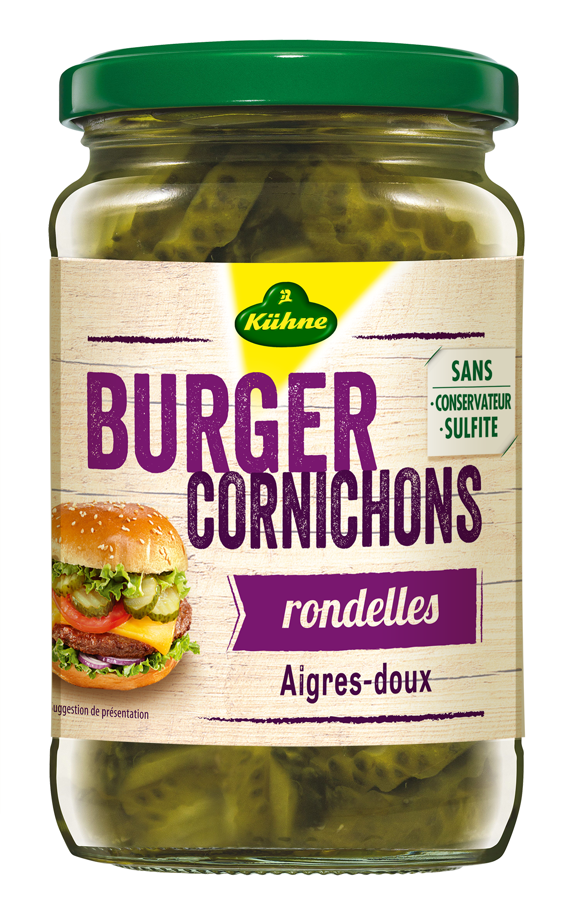 Mettez du goût , du croquant et de la fraicheur dans vos préparations ! Déja coupé en rondelles, les cornichons Spécial Burger vous permettent de réaliser facilement de savoureux Burger avec en prime tout le bon gout de la célèbre recette aigre-douce Kühne, à la saveur douce et gourmande. Découvrez également nos cornichons spécial Salade et nos cornichons spécial SANDWICH ! Cornichons préparés à partir de fruits frais et conditionnés immédiatement après récolte. Kühne, plutôt deux fois Kühne !