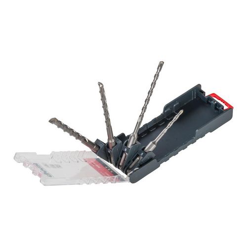 Jeu de 4 forets pour perceuse à percussion, tige de fixation pour SDS plus, pointe de perçage autocentreuse, brasés à haute température, spirale multiple pour un transport optimal de la sciure et des copeaux, frottement minimum aux parois et développement minimum de chaleur, optimisés pour les vibrations.