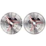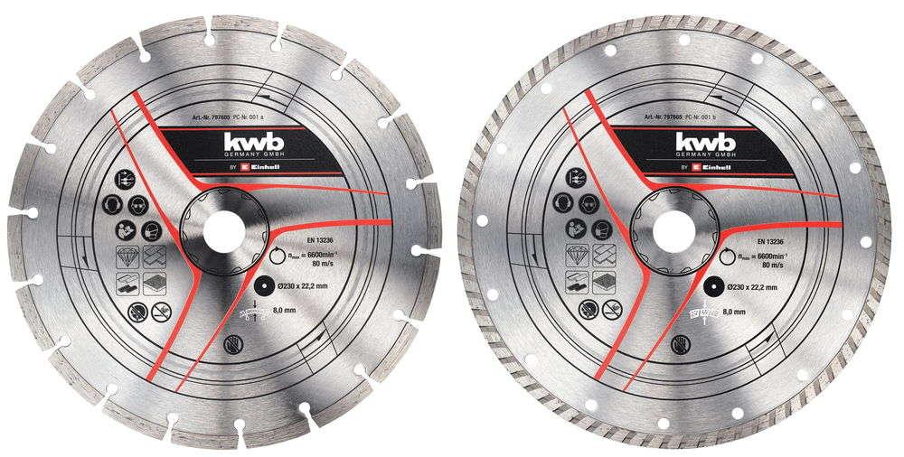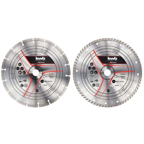 Premier disque de coupe à jante continue très performant pour carrelage, grès cérame ou travertin Ø, 230 mm, alésage central 22,23 mm La jante continue a une hauteur de 8 mm et une épaisseur de 3,3 mm. Second disque de coupe diamant à jante Turbo multi-segments pour des performances élevées dans la pierre. Ø, 230 mm, alésage central 22,23 mm Jante Turbo de hauteur 8 mm et d&rsquo,épaisseur 2,6 mm. Les deux disques s&rsquo,adaptent sur quasiment toutes les meuleuse d&rsquo,angle usuelles avec une vitesse circonférentielle de 80 m/s. Ces disques de coupe peuvent être utilisés à un régime maximal de 6 600 tours par minute.