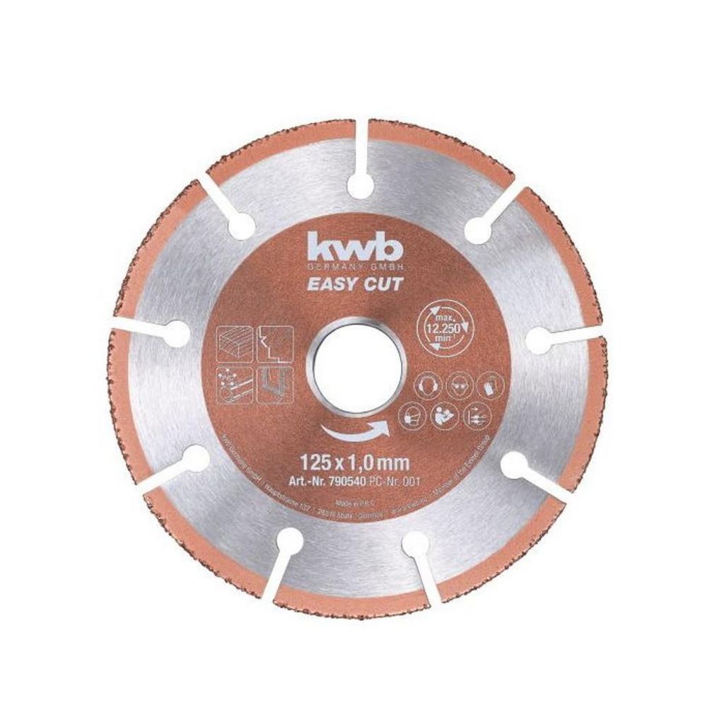 Disque à tronçonner universel au carbure, Ø 125 mm, bord à concrétion carbure pour des performances stables dans divers matériaux, avec protection anticorrosion, convient pour le travail du bois, pour du bois avec des clous, des matières synthétiques, des parois de construction sèche et des tuyaux de cuivre, pour des vitesses de rotation jusqu'à 13 000 tr/mn, convient à toutes les meuleuses d'angle courantes avec un alésage de 22,23 mm.
