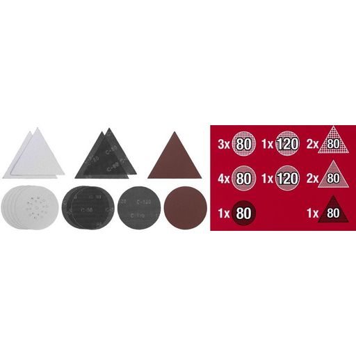 Le kit d'accessoires pour ponceuses cloisons sèches Einhell comprend 15 grilles abrasives de diamètre 225 mm ou de longueur d'arête 287 mm disponibles en plusieurs grains. Avec 5 grilles et triangles différents de grain P80 Avec 8 grilles abrasives circulaires de grain P80 et 2 grilles abrasives circulaires de grain P120 Pour poncer le mastic et les aspérités des cloisons sèches ou des sols, et pour enlever le papier peint, la peinture, la rouille et les enduits friables S'adaptent notamment sur les ponceuses pour cloisons sèches TE-DW 225 X et TC-DW 225 Einhell