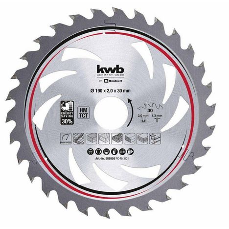 Lame de scie au carbure de tungstène (TCT) 30 dents, Ø, 190 mm, alésage central 30 mm, épaisseur 1,8 mm Pour les bois durs, bois tendres, bois composites et plastiques Ses propriétés améliorées permettent une vitesse de coupe supérieure pour une économie d&rsquo,énergie jusqu&rsquo,à 30 %. Ell