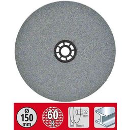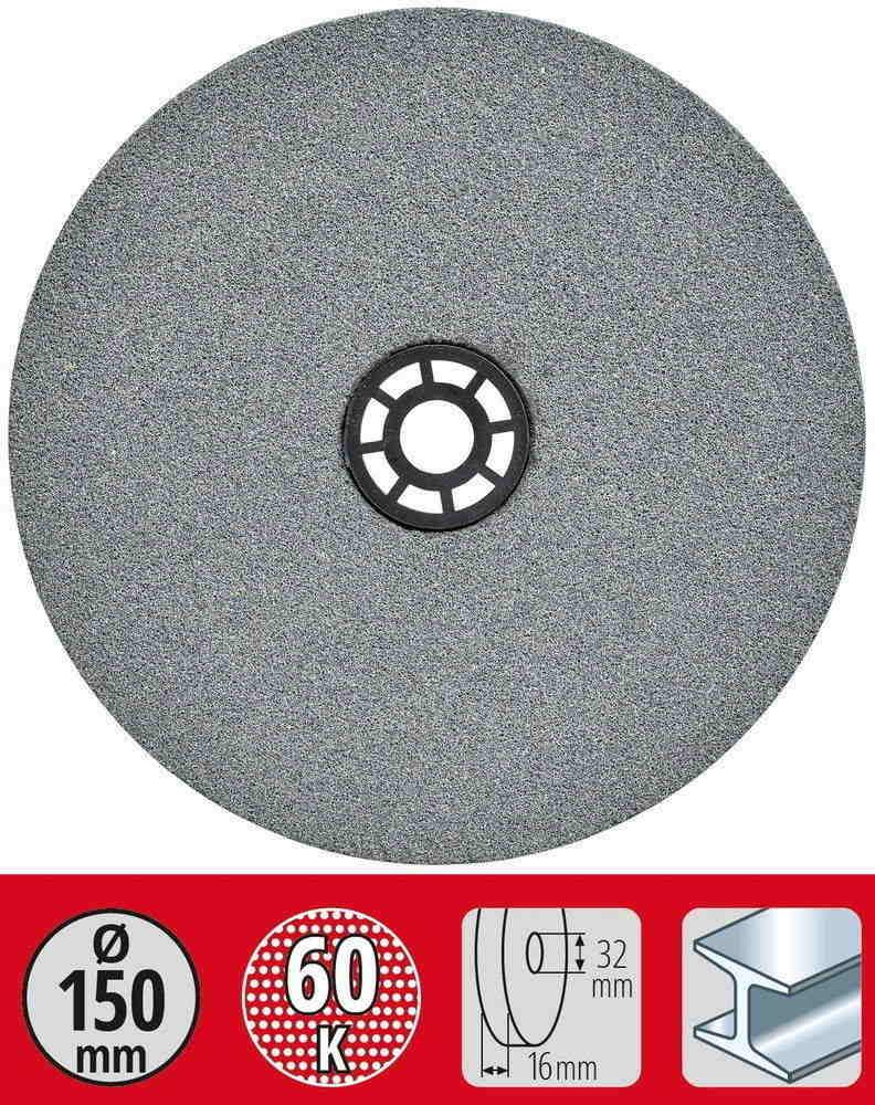Diamètre : 150 mm Largeur : 16 mm Alésage central : 32 mm Gros grains N60 est idéal pour métal. Avec 4 éléments liaison Ø, 25/20/16/12,7mm Pour tourets à meuler TH-KS 240, TH-BG 150, TC-WD 150/200 et TH-US 240 Einhell