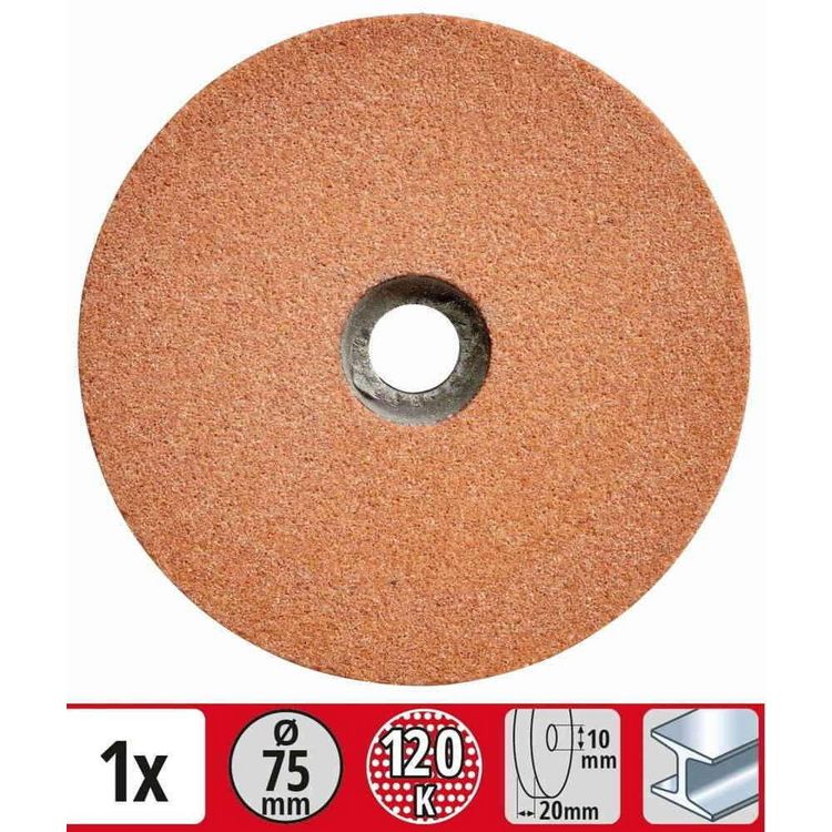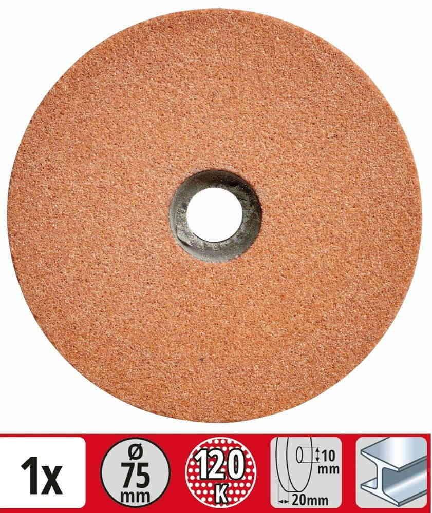 Diamètre : 75 mm Largeur : 20 mm Alésage central : 10 mm Le disque de ponçage fin de granularité N120 est idéal pour poncer le métal. Le disque de ponçage peut être utilisé avec le touret à meuler TH-XG 75 Einhell