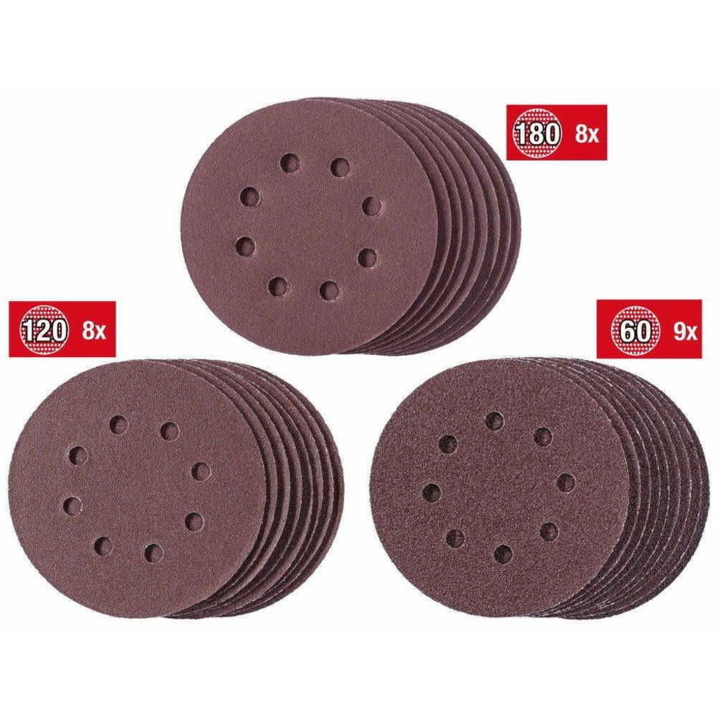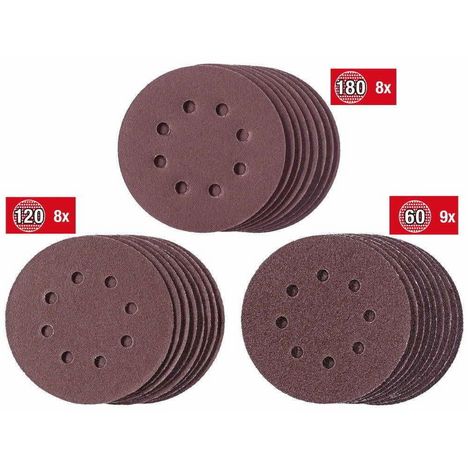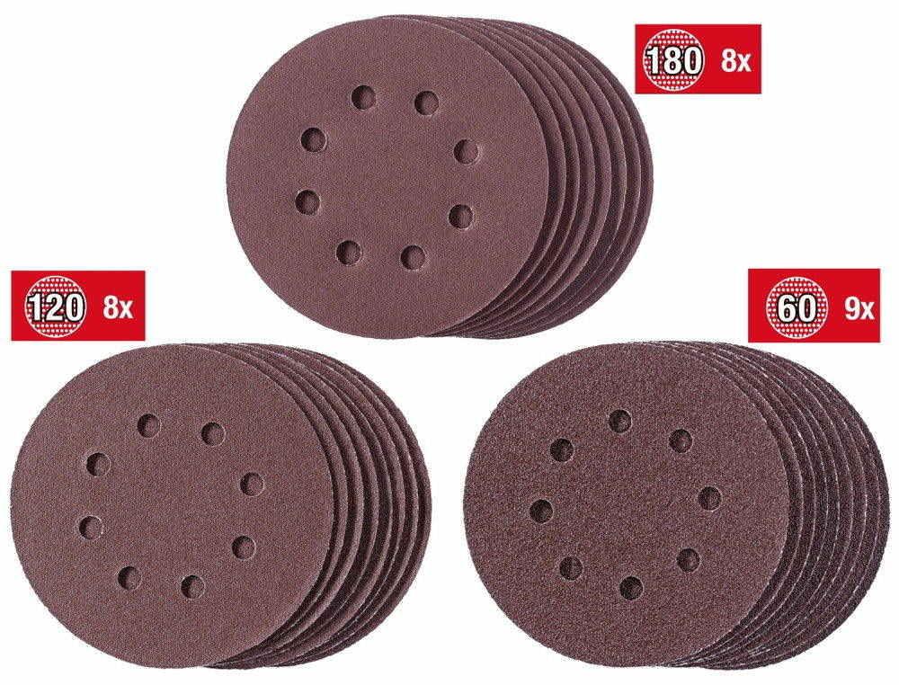 Le kit comprend 25 disques abrasifs. Leur diamètre est de 125 mm. Ces disques abrasifs sont dotés d'un système de fixation rapide très pratique. Le kit comprend 9 disques abrasifs de grain K60, 8 disques abrasifs de grain K120 et 8 disques abrasifs de grain K180. Pour ponceuses BT-RS 420 E, RT-XS 28, BES 125, TC-RS 38 E, TE-RS 40 E Einhell