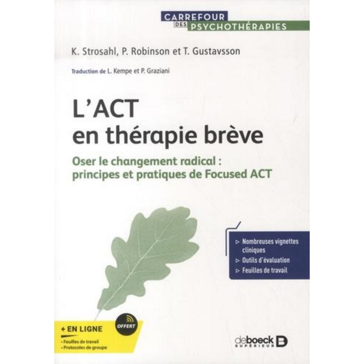 Aidez vos patients plus rapidement et efficacement ! . Comment aider les patients à développer les compétences psychologiques dont ils ont besoin rapidement et efficacement pour mener une vie épanouie ? C'est un vrai défi pour tout clinicien travaillant avec des patients aux prises avec des problèmes de santé mentale, de toxicomanie ou d'adaptation à la vie. Les outils et stratégies présentés permettront à vos patients de s'engager sur la voie du changement en adaptant leurs comportements et actions en accord avec leurs valeurs. Vous trouverez dans ce livre des : - outils d'évaluation et de formulation de cas prêts à l'emploi , - questions ciblées pour aider les patients , - outils pour augmenter la motivation au changement , - méthodes pour construire rapidement des plans de traitement efficaces , - ainsi que de nombreuses stratégies d'intervention brèves basées sur la thérapie d'acceptation et d'engagement (ACT).