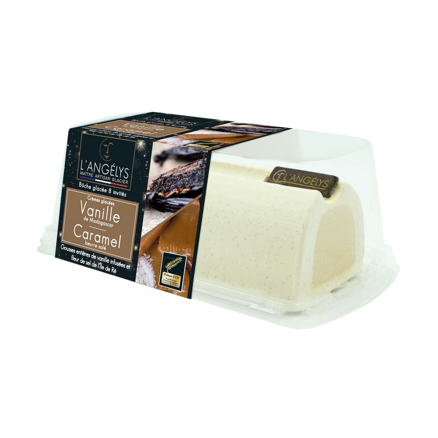 Dessert glacé composé d'une crème glacée Vanille gousses entières infusées et d'une crème glacée Caramel beurre salé