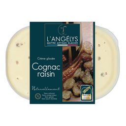 LAIT écrémé réhydraté, sucre, raisins (1) (raisins, huile de colza ou tournesol) macérés au Cognac XO 10 %, jaune d'ŒUF de poules élevées en plein air, CRÈME, sirop de glucose, Cognac XO 4 %, BEURRE concentré, LAIT écrémé en poudre, protéines de LAIT, fibre d'agrumes, fibres de pois, stabilisants (farine de graines de caroube, gomme guar).