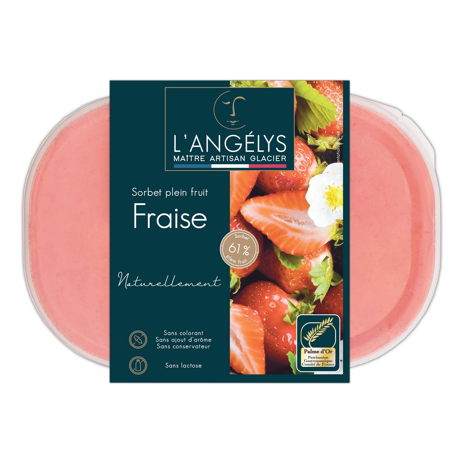 Des fraises entières cueillies à pleine maturité et juteuses, pulpées, façonnées en sorbet après une maturation lente : c'est ça la patte de notre Maître Artisan glacier, une patience nécessaire pour conjuguer naturalité et gourmandise.