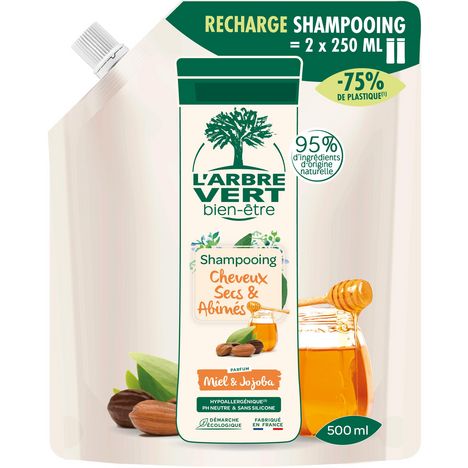 L'Arbre Vert Bien-être Recharge Shampooing Cheveux secs et abîmés Parfum Miel & Jojoba - Hypoallergénique - pH Neutre et Sans Silicone - 95% d'ingrédients d'origine naturelle - 500mL