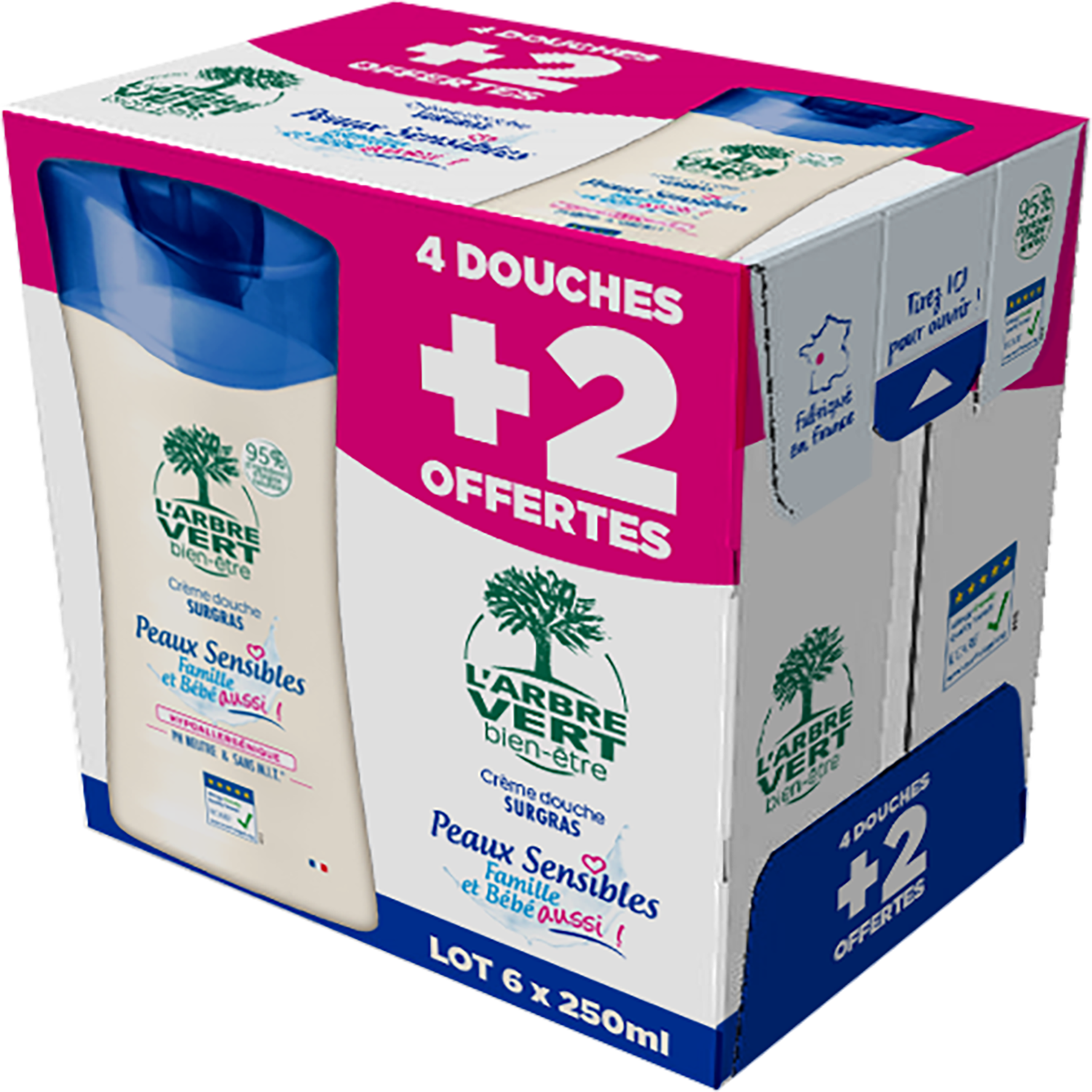 L'Arbre Vert Bien-être Carton Crème Douche Peaux sensibles Famille et Bébé aussi! - Hypoallergénique - 95% d'ingrédients d'origine naturelle - ECARF - 4x250mL - 4+2 OFFERT