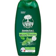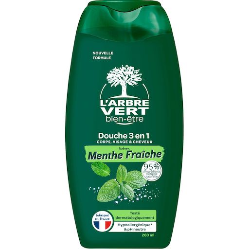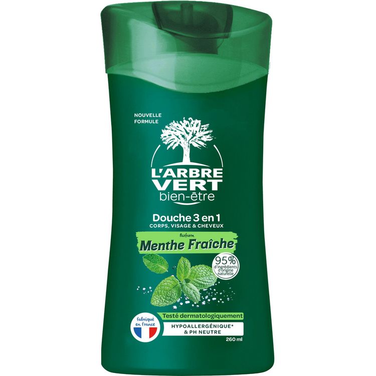L'Arbre Vert Bien-être Gel Douche Homme 3 en 1 Visage Corps Cheveux Parfum Menthe fraîche - Hypoallergénique et pH Neutre - 95% d'ingrédients d'origine naturelle - 260mL