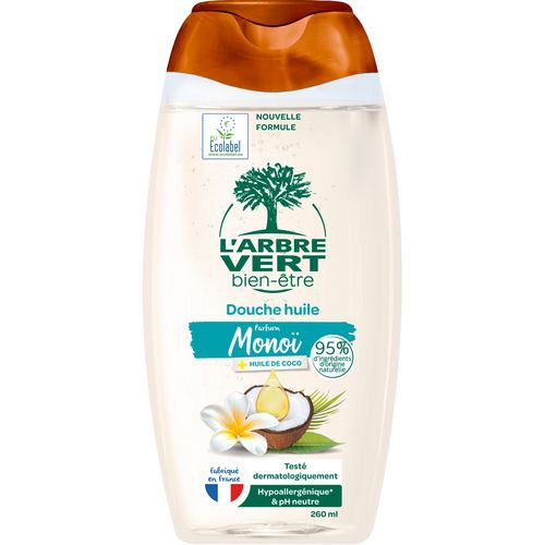 L'Arbre Vert Bien-être Douche Huile Ecolabel Parfum Monoï + huile de Coco - Hypoallergénique & pH Neutre - 95% d'ingrédients d'origine naturelle - 260mL