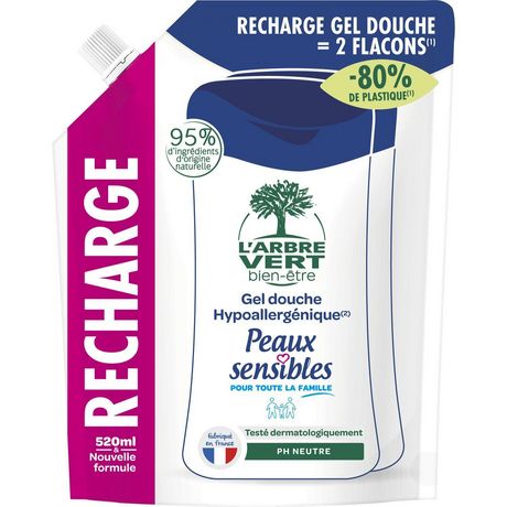 Offrez-vous une douche de bien-être grâce à sa texture onctueuse et son parfum doux.Sa formule hydratante au pH neutre respecte les peaux de toute la famille.Cette recharge permet de remplir deux fois le flacon de gel douche 260 ml L?Arbre Vert bien-être. Une recharge, c'est 80% de plastique en moins par rapport à deux flacons 260 ml.RESPECT DE LA PEAU- Testé sous contrôle dermatologique.- Hypoallergénique, conçu pour minimiser le risque d?allergie cutanée(1).- pH neutre pour la peau.DÉMARCHE ÉCOLOGIQUE- 95% d?ingrédients d?origine naturelle.- Formulé à partir d?ingrédients à écotoxicité réduite.- Fabriqué en France, dans notre usine à Saint-Benoît.- Formule végan.1. Nous excluons de ce produit les substances responsables d?allergie cutanée répertoriées à l?Annexe III du Règlement (CE) n°1223/2009