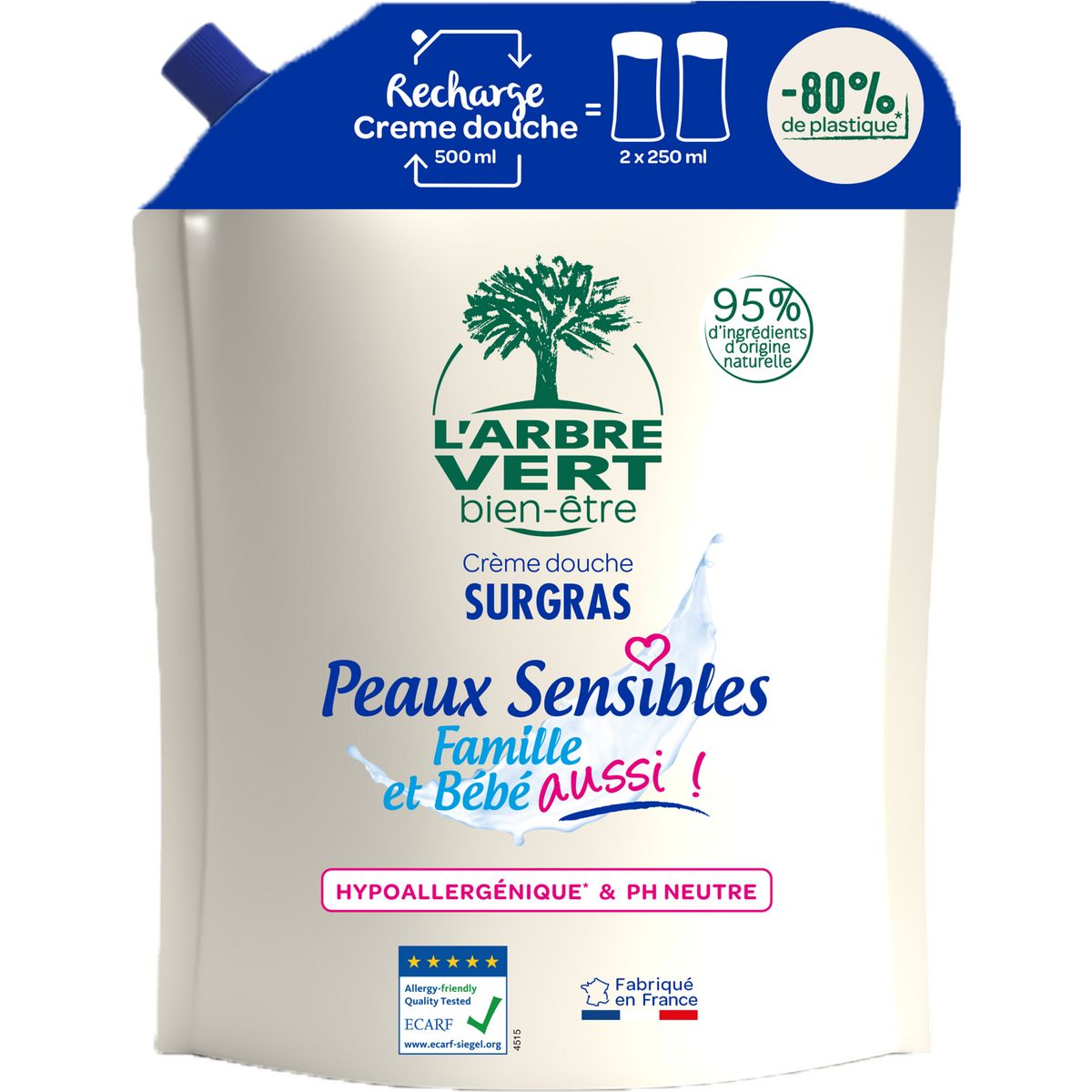 L'Arbre Vert Bien-être Recharge Crème douche Peaux sensibles Famille et Bébé aussi! - Hypoallergénique 95% d'ingrédients d'origine naturelle 500mL