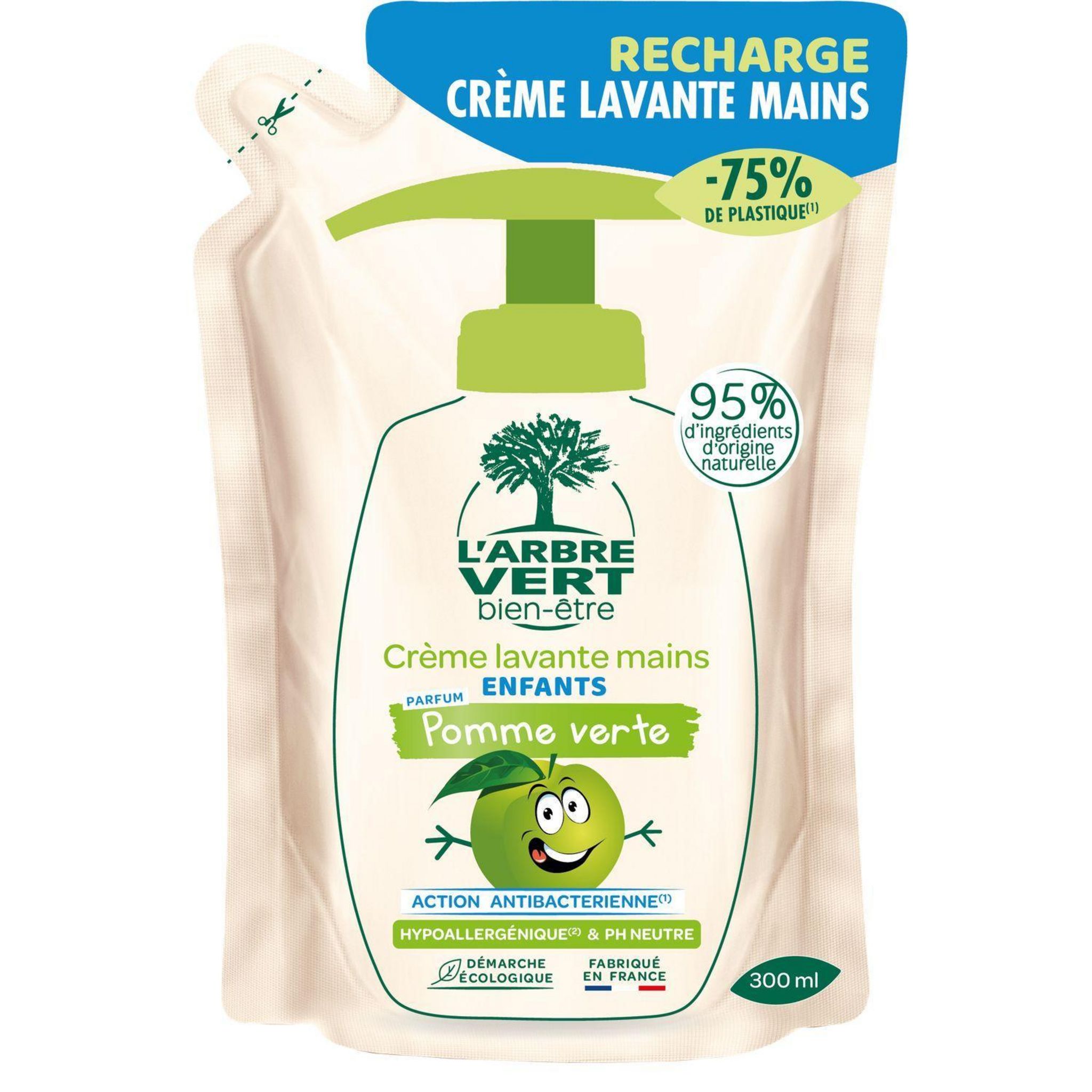 L'Arbre Vert Bien-être Recharge Crème Lavante Mains Enfants Parfum Pomme Verte - Hypoallergénique et pH Neutre - 95% d'ingrédients d'origine naturelle - 300 mL