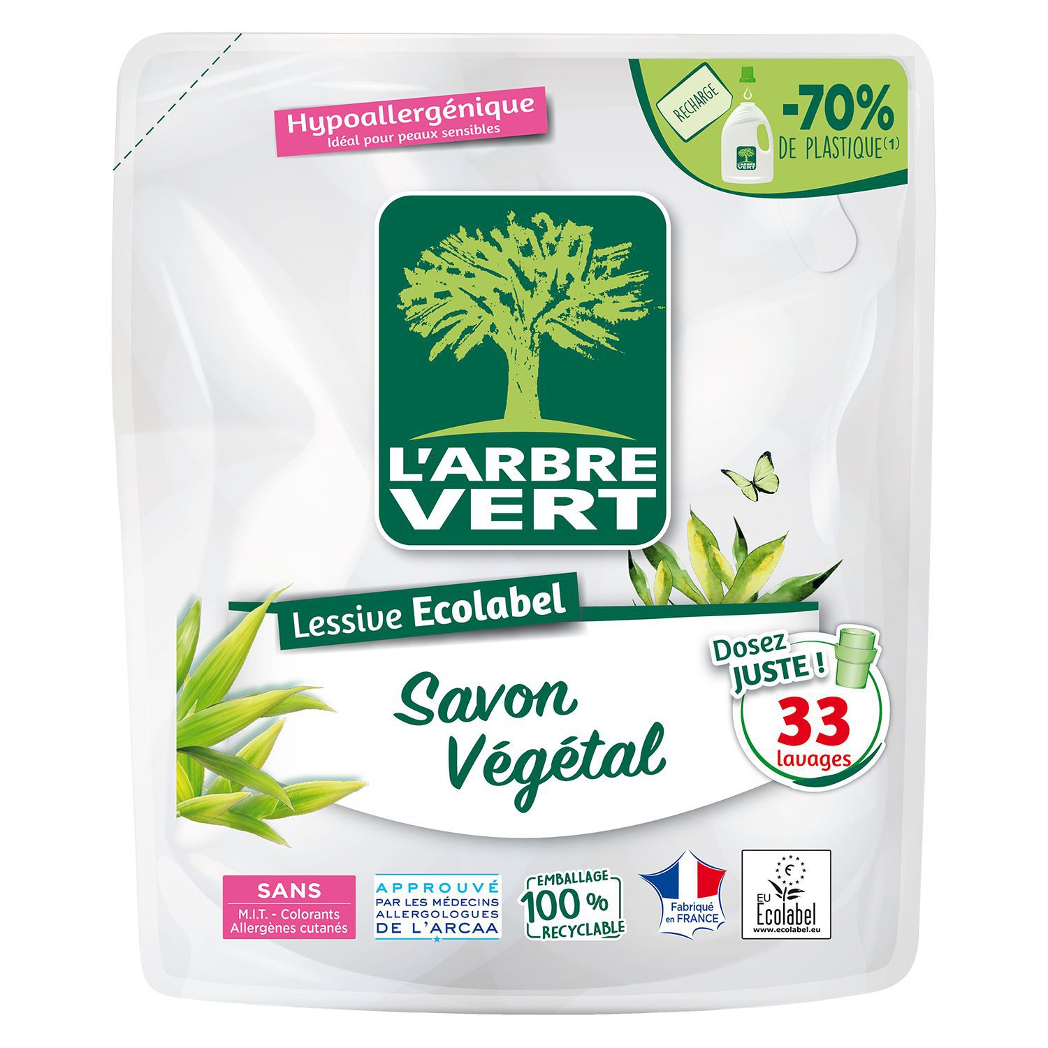 La lessive concentrée L'ARBRE VERT respecte la personne et l'environnement. Le format recharge permet de réduire de 70% le plastique utilisé par rapport au bidon.