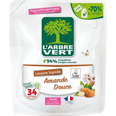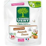 L'Arbre Vert Recharge Lessive Ecolabel Amande Douce - Hypoallergénique -34 Lavages - 94% d'ingrédients d'origine naturelle - 1,53L