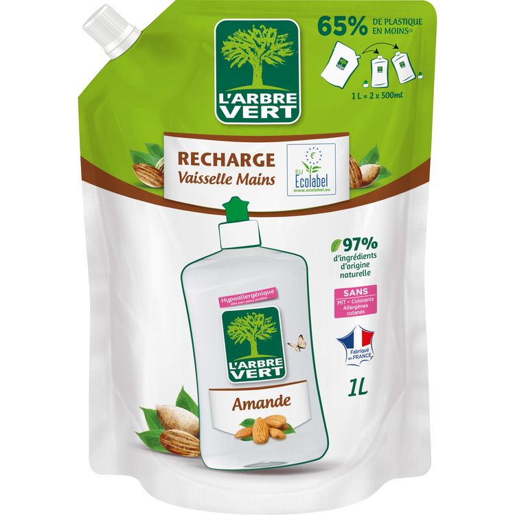 L'Arbre Vert Recharge Vaisselle Ecolabel Mains Amande - Hypoallergénique - 97% d'ingrédients d'origine naturelle - 1L