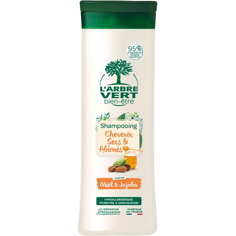 L'Arbre Vert Bien-être Shampooing Cheveux Secs et Abîmés Parfum Miel et Jojoba - Hypoallergénique - pH Neutre et Sans Silicone - 95% d'ingrédients d'origine naturelle - 250mL