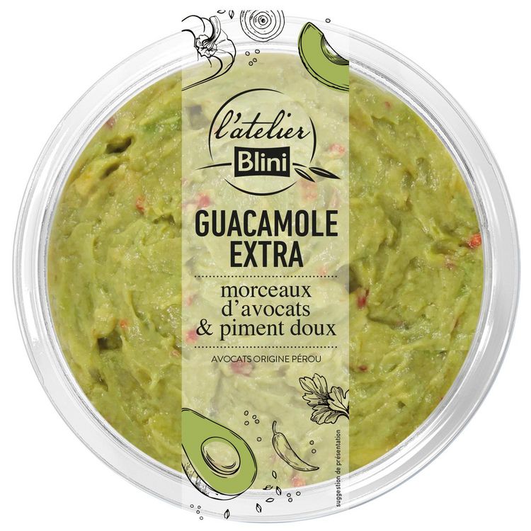 Ingredients : morceaux d'avocat 91% (avocat 90%, sel, antioxydant : E300, correcteur d'acidite : E330) - poivron rouge - oignon - sel - piment Jalapeno 0,7% - coriandre - jus concentre de citron vert - epaississant : E415 - oignon deshydrate - cumin en poudre - poivre en poudre - conservateur : E202 - sauce piment (vinaigre, piment rouge, sel).