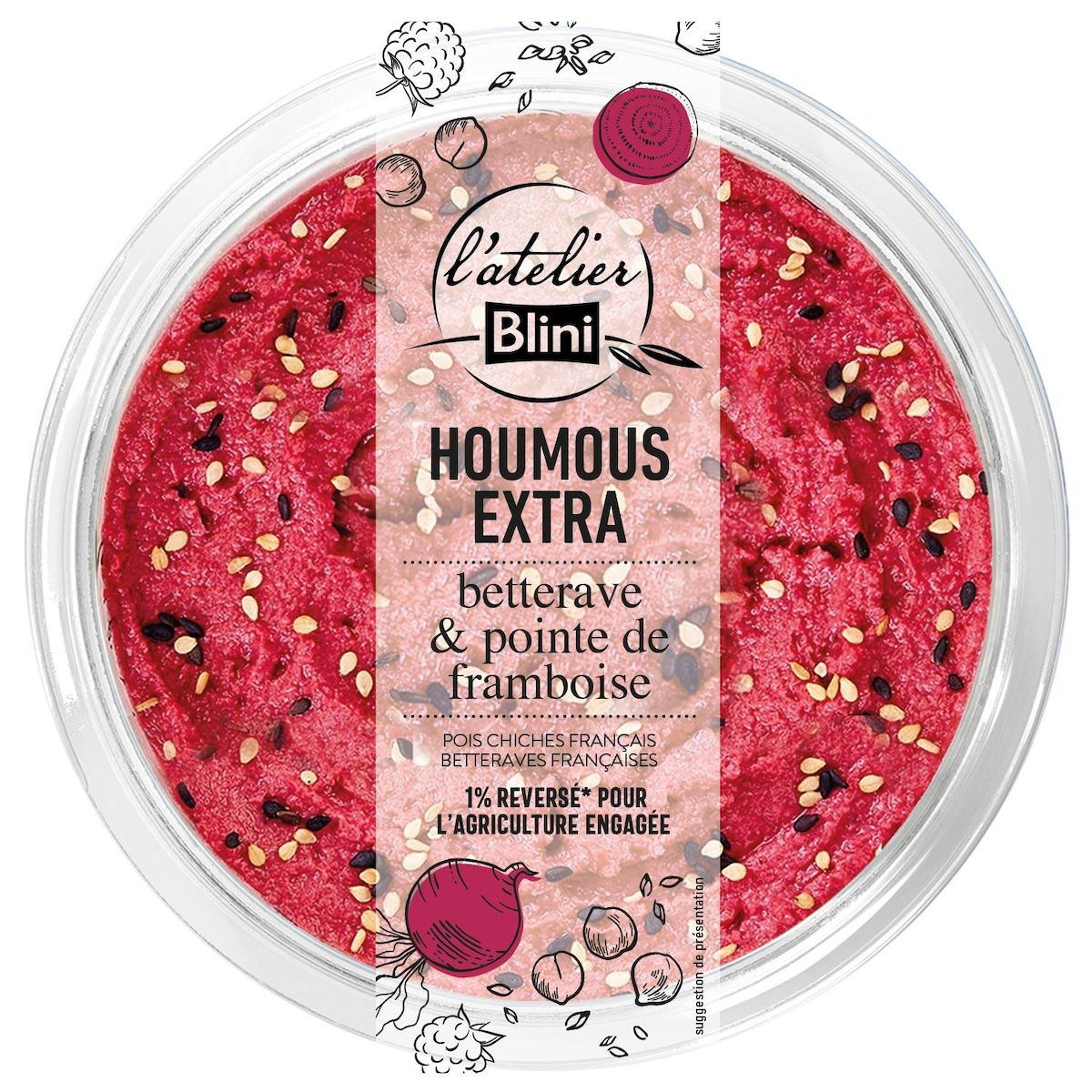 pois chiches 44%, puree de betterave rouge 37%, huile de colza, puree de framboise 3%, eau, fromage de chevre (contient LAIT), concentre de jus de citron, sel, GRAINES DE SESAME dorees, graines de nigelle, ail en poudre, conservateur : E202.