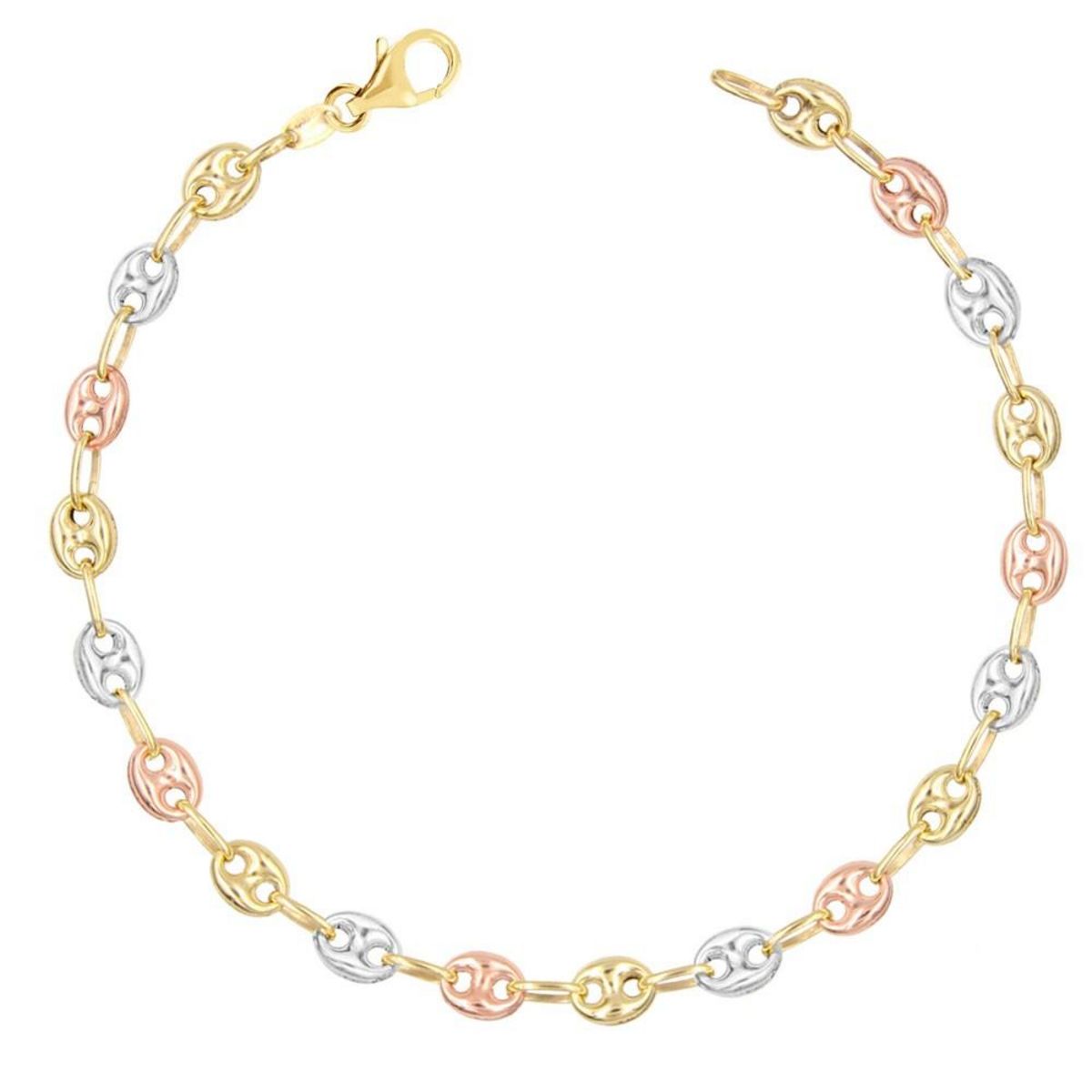 ⭐ Collection Les Classiques de la Bijouterie⭐ Bracelet Maille Grain de Café Or 375/000 Tricolore Jaune, Blanc et Rose⭐ Longueur 19cm - Largeur des grains 4.7mm ⭐ Modèle Femme⭐ Poids indicatif 3.05gr⭐ Bijou livré dans un écrin et accompagné d'un certificat d'authenticité