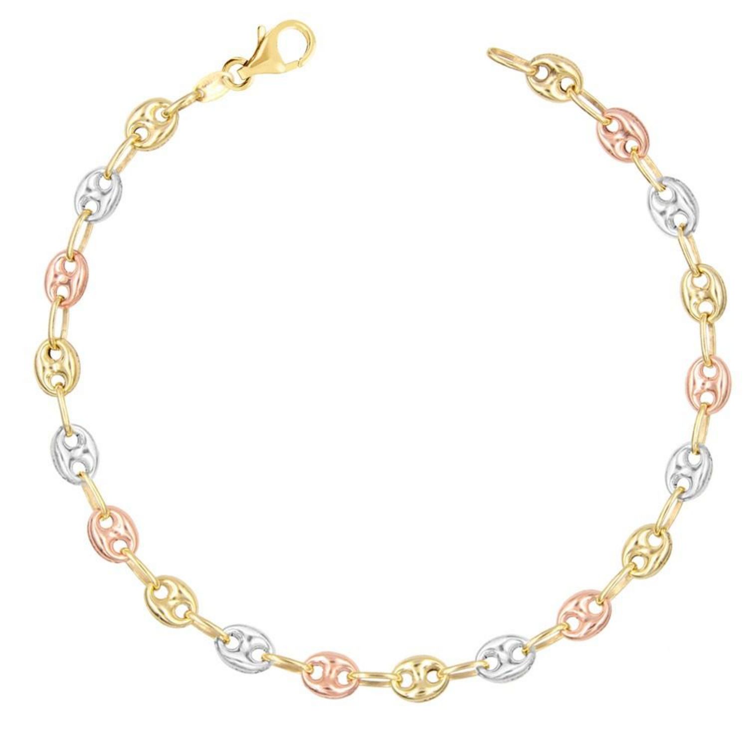 ⭐ Bracelet Maille Grain de Café Or 375/000 Tricolore Jaune, Blanc et Rose⭐ Longueur 19cm - Largeur des grains 4.7mm ⭐ Modèle Femme⭐ Poids indicatif 3.05gr⭐ Bijou livré dans un écrin et accompagné d'un certificat d'authenticité