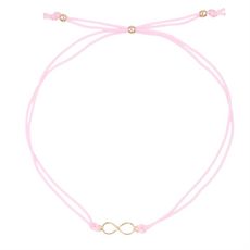 Bracelet Or 375/000 JauneMotif Infini Or jaune et cordon rose réglableModèle FemmePoids Indicatif 0.30 grBijou livré dans un écrin et accompagné d'un certificat d'authenticité