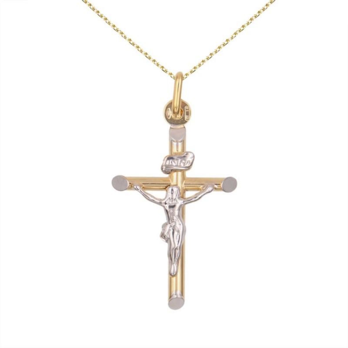 Pendentif Or 18 Carats 750/000Croix Or Bicolore Jaune et Blanc Rhodié - Christ sur la CroixDimensions 2.5cm*1.7cm - Poids Indicatif : 1.45grChaîne Forçat Dorée Offerte - 45cmBijou livré dans un écrin et accompagné d'un certificat d'authenticité