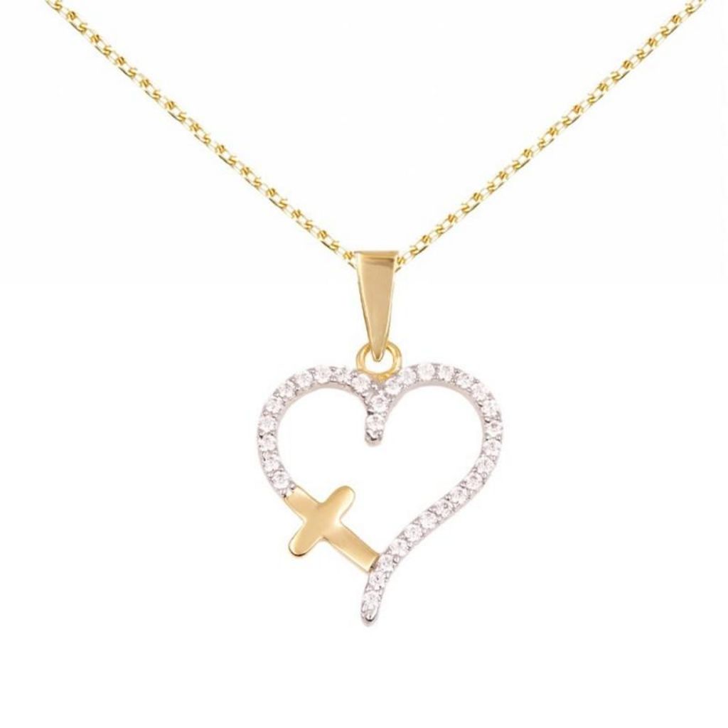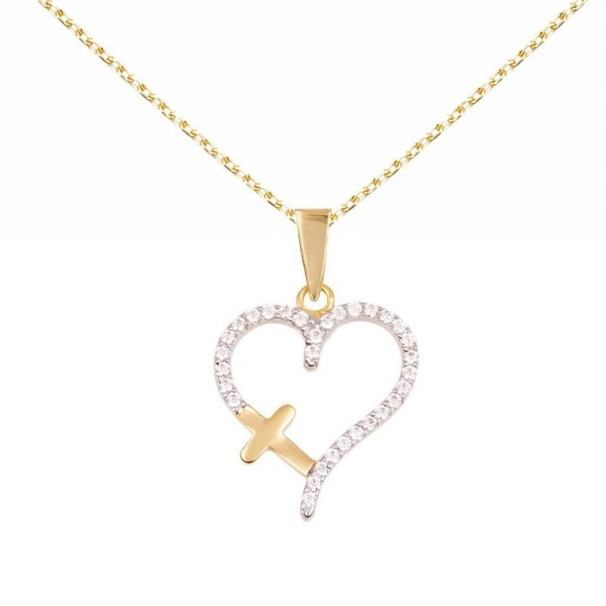 Collier - Pendentif Or Jaune et Zirconiums - Motif Coeur et Croix - Chaine Dorée
