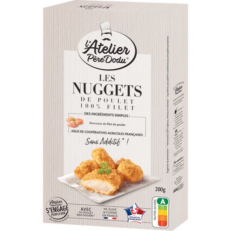 Les Nuggets 100% filets de l'Atelier Père Dodu c'est comme si vous les aviez faits vous-même : des filets de poulet français tranchés et marinés pour la touche d'assaisonnement, puis enrobés d'une chapelure crousti-fondante réalisée à partir de blé français.