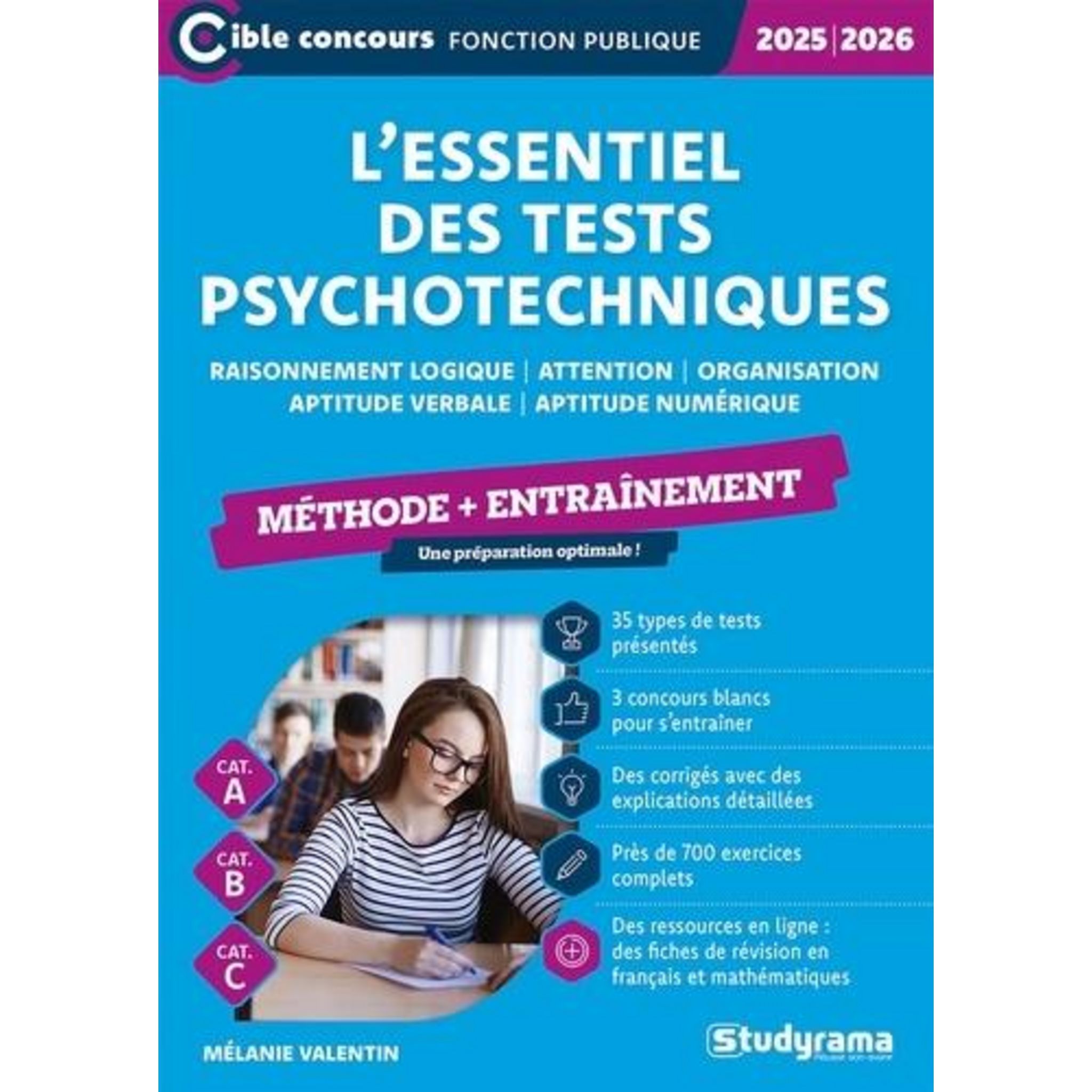 UN OUTIL INDISPENSABLE. Cet ouvrage s'adresse aux candidats préparant les concours administratifs de catégorie C comprenant une épreuve de tests psychotechniques. La réussite de cette épreuve nécessite une préparation soutenue et l'acquisition d'une méthode solide pour parvenir à se montrer à La fois rapide et efficace. A travers un entrainement intensif en situation de concours, des conseils méthodologiques et des rappels de cours,. ce livre offre tous les outils nécessaires pour apprendre à maitriser les contraintes propres à l'épreuve : gestion du temps, compréhension des consignes et mobilisation des connaissances. LES DIFFERENTS TYPES DE TESTS. Raisonnement logique . cartes à jouer, dominos, suites, carrés magiques... Attention : codage, tableaux de données, comparaisons, repérage... Organisation : logigrammes, plannings, cases à noircir... Aptitude verbale : synonymes, anagrammes, palindromes, analogies... Aptitude numérique : calcul mental, unités de mesure, surfaces, pourcentages... STUDYRAMA, PARTENAIRE DE VOTRE REUSSITE. En tant qu'acteur référent du monde de l'orientation et de t'aide à la réussite aux examens et aux concours, notre vocation est de vous accompagner et de vous conseiller tout au long de votre parcours.