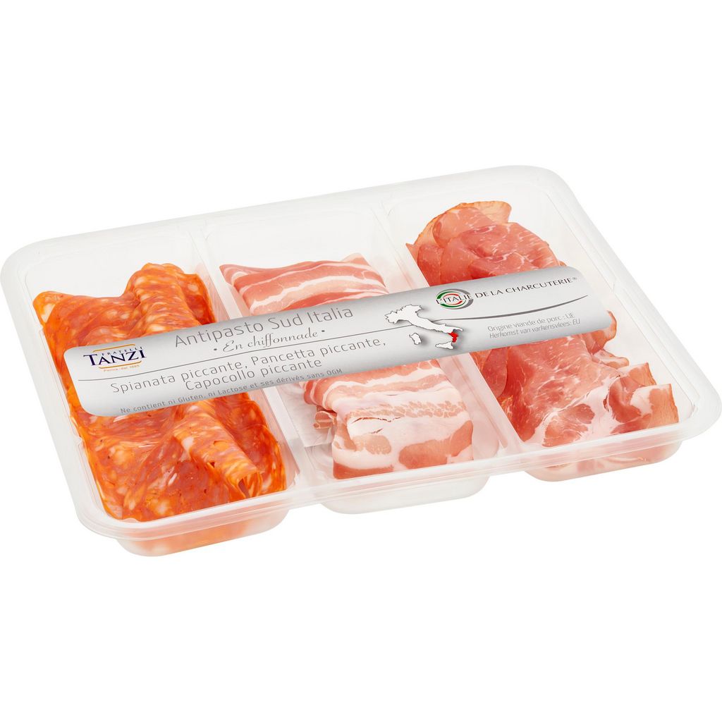 Spianata piccante (34%) : viande de porc (origine : UE), concentré de piment piquant (piment piquant 98% et sel), sel, arômes, dextrose, saccharose, épices (y compris le piment calabrais (0.2%)), arômes fumée, antioxydant : E300, conservateurs : E252-E250.