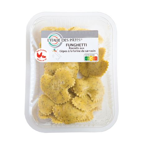 ricotta 32% (LACTOSÉRUM, LAIT, sel), semoule de BLÉ dur 22%, farine de BLÉ tendre 16%, ŒUFS (poules élevées au sol) 12%, cèpes 5%, chapelure (farine de BLÉ, levure, sel), ), farine de sarrasin 2%, eau, fromage râpé (LAIT, sel, présure, conservateur : lysozyme d'ŒUF), cèpes séchées 0.7%, sel, Grana Padano AOP (LAIT, sel, présure, conservateur : lysozyme d'ŒUF), huile d'olive vierge extra, plantes aromatiques, épices, farine de riz.
