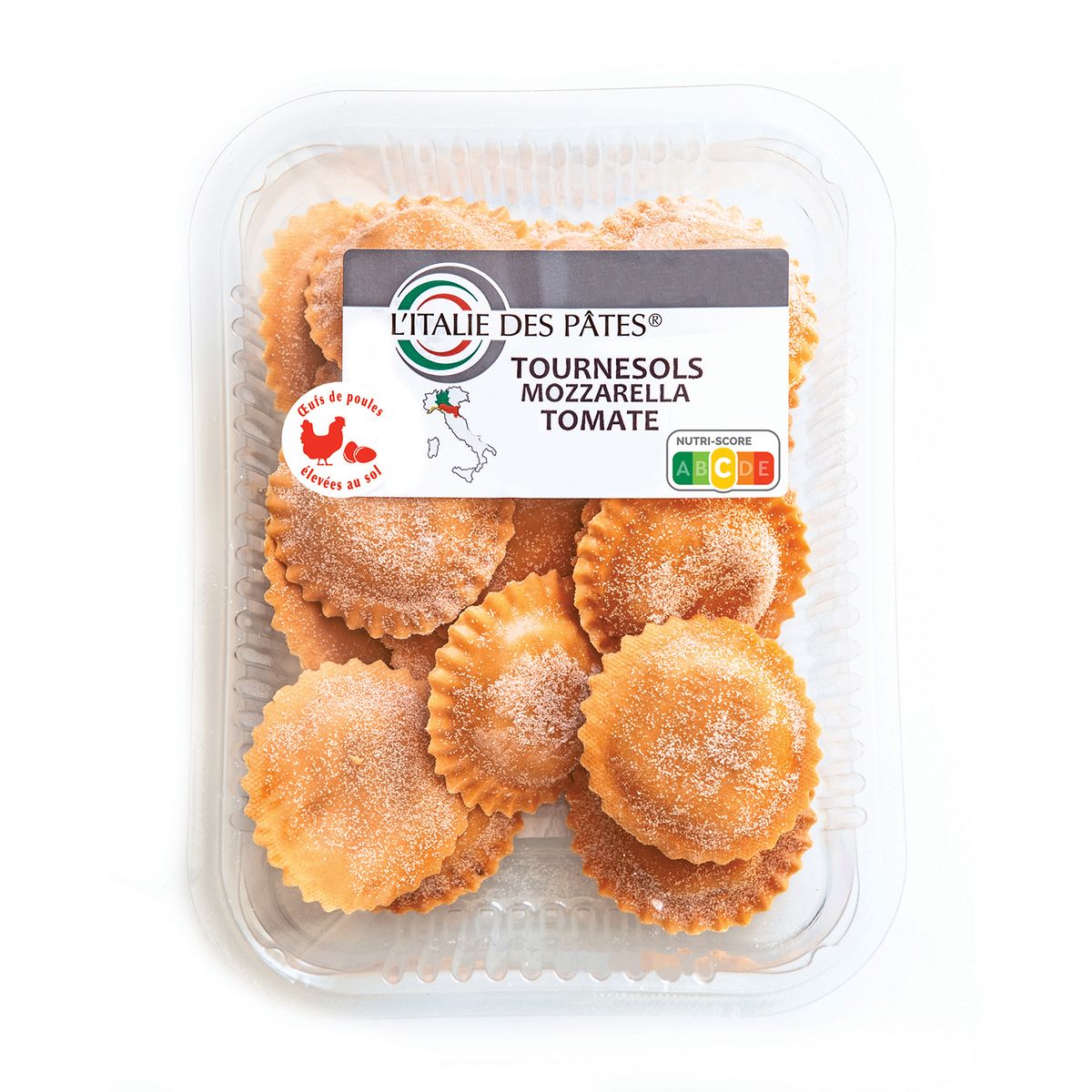 Authentiques pâtes fraîches italiennes, aux œufs de poules élevées au sol, ces tournesols sont farcis à la mozzarella (9%), tomates (5%), et Grana padano AOP. Leur cuisson ultra rapide en fait un produit à déguster facilement, un vrai régal !