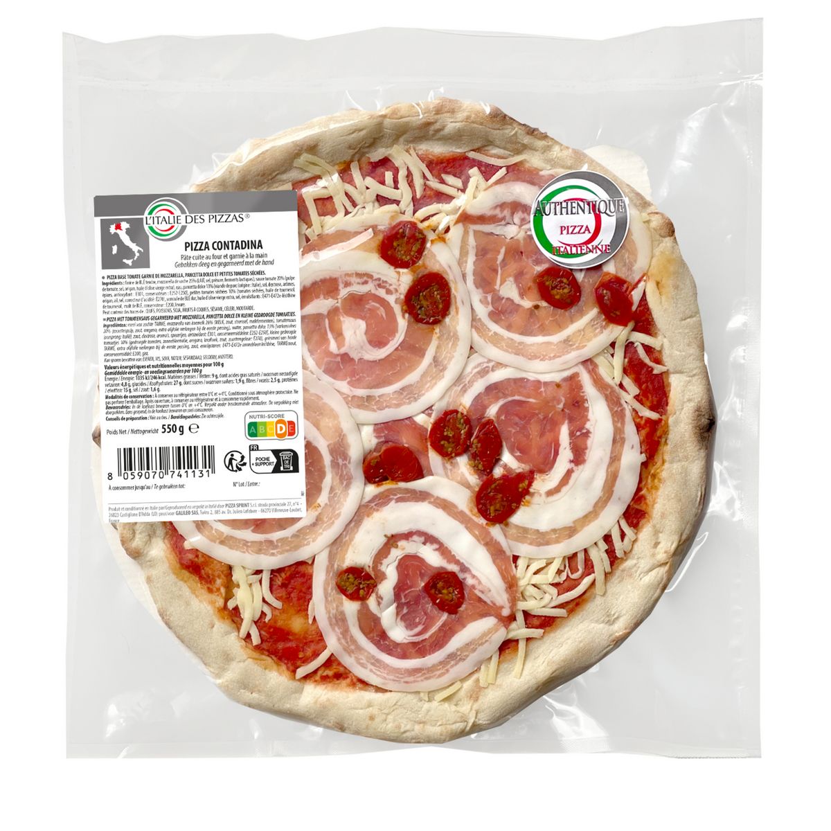 Pizza fraîche, base tomate, garnie de mozzarella, pancetta dolce et petites tomates séchées