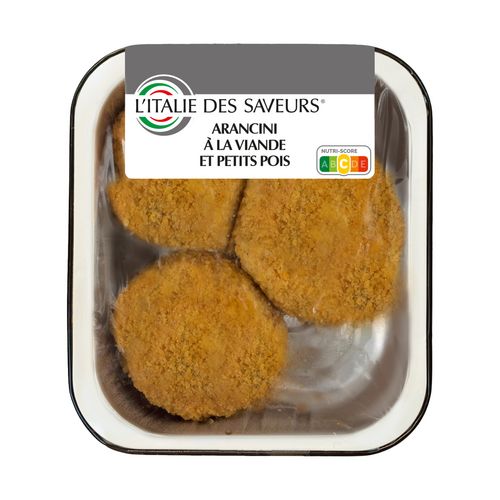 base de riz [riz 64% du poids total des ingrédients, sauce (tomate, huile de tournesol, oignon, huile d'olive, basilic, sel, sucre), Grana Padano DOP (LAIT, sel, présure, lysozyme d'OEUF), BEURRE, huile de tournesol, préparation pour bouillon (sel, extrait de protéines végétales avec SOJA, légumes en proportions variables (carotte, oignon, CÉLERI), extrait de levure, huile de tournesol), curcuma], farce [viande de poulet 5% du poids total des ingrédients (origine : Italie), sauce (tomate, huile de tournesol, oignon, huile d'olive, basilic, sel, sucre), petits pois 2% du poids total des ingrédients, huile de tournesol, amidon de riz, oignon, vin blanc, préparation pour bouillon (sel, extrait de protéines végétales avec SOJA, légumes en proportions variables (carotte, oignon, CÉLERI), extrait de levure, huile de tournesol), sel], panure (eau , farine de maïs, farine de BLÉ, amidon de maïs, sel, arôme naturel, levure de bière, paprika, curcuma, conservateur : E200, régulateur d'acidité : E330, huile de tournesol).