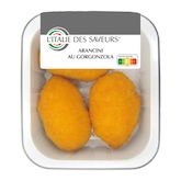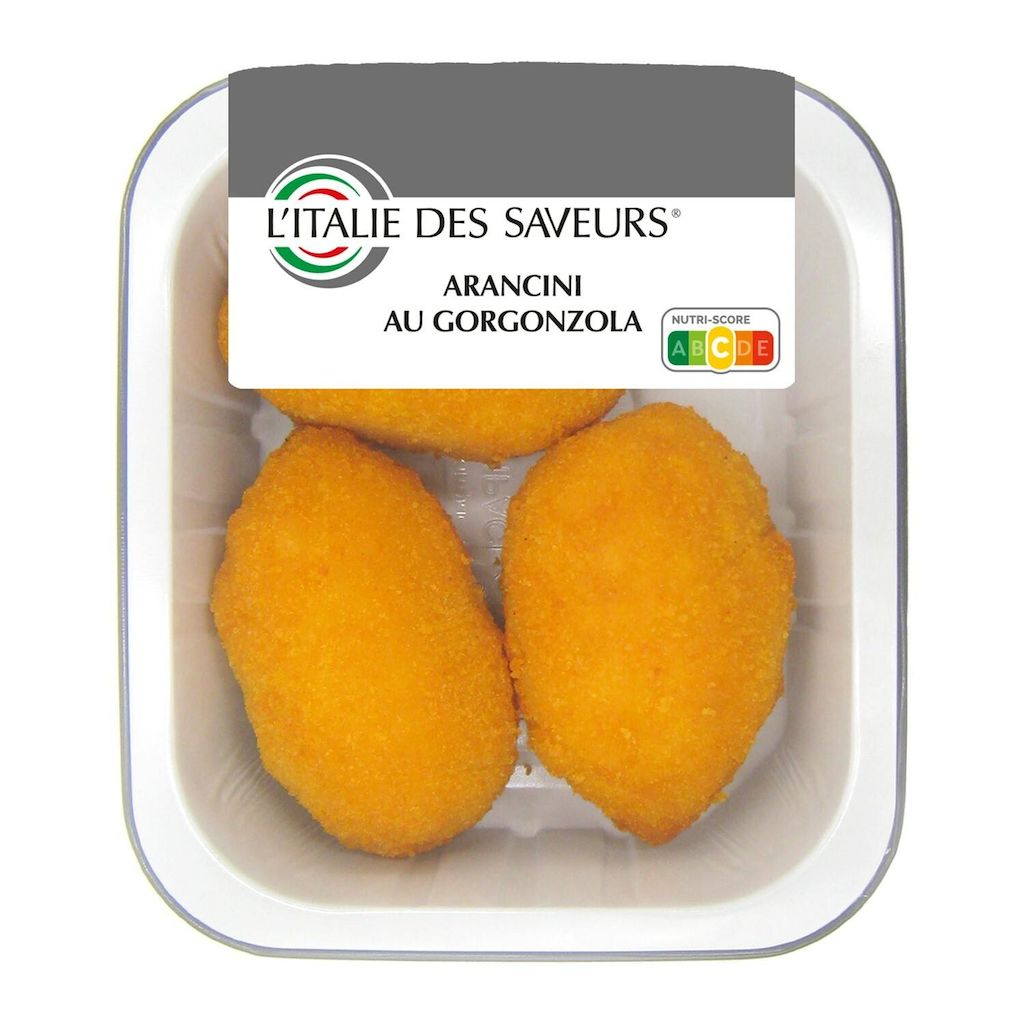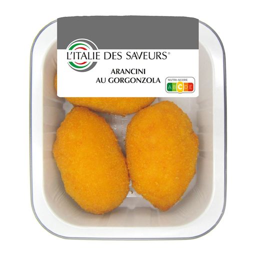 arancino [riz 68%, sauce béchamel (LAIT frais entier, farine de BLE, BEURRE, huile de tournesol, sel), fromage GORGONZOLA 5.1%, fromage Grana Padano (LAIT, sel, présure, conservateur : lysozyme d'OEUF), amidon de riz, huile de tournesol, BEURRE, oignon, bouillon (sel, extrait de maïs et de SOJA, légumes en proportions variables (carotte, oignon, CELERI), huile de tournesol), sel, arômes], chapelure (eau, farine de maïs, farine de BLE, amidon de maïs, sel, sucre, levure de bière, poudre à lever : E450i, E500i ; épaississants : E415, E461 ; curcuma, paprika, conservateur : E200, régulateur d'acidité : E330).
