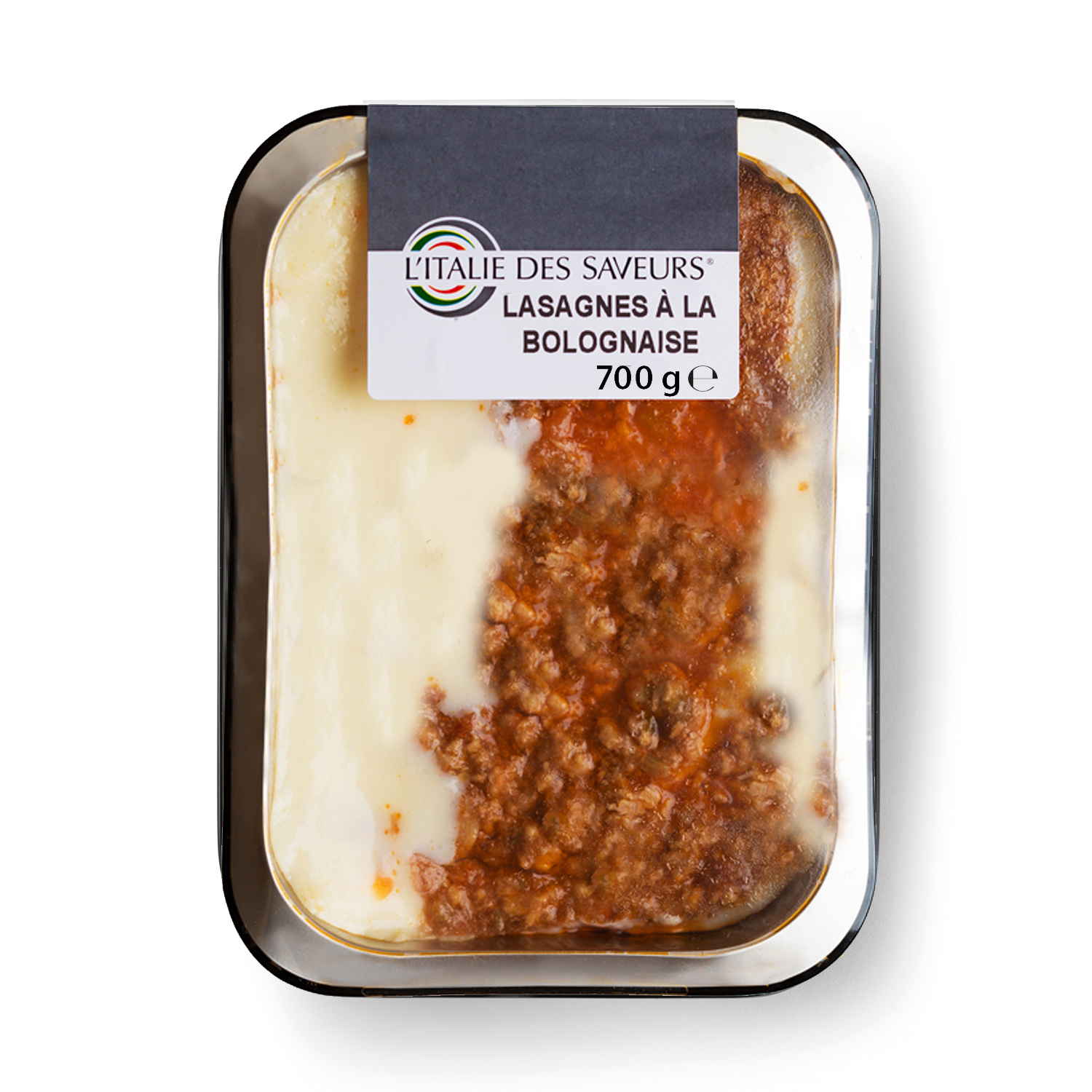 sauce bolognaise 42% (viande de bœuf et de porc (16% du total des ingrédients) (Origine : UE), tomate, huile de tournesol, légumes en proportion variable (carottes, oignon, CELERI), vin blanc, sel, BEURRE, fibres alimentaires, sucre, huile d'olive, mélange d'épices et de plantes aromatiques en proportion variable), béchamel (eau, LAIT entier, fécule de pomme de terre, fibres alimentaires, arômes, sel), pâte (semoule de BLÉ dur, ŒUFS, eau).