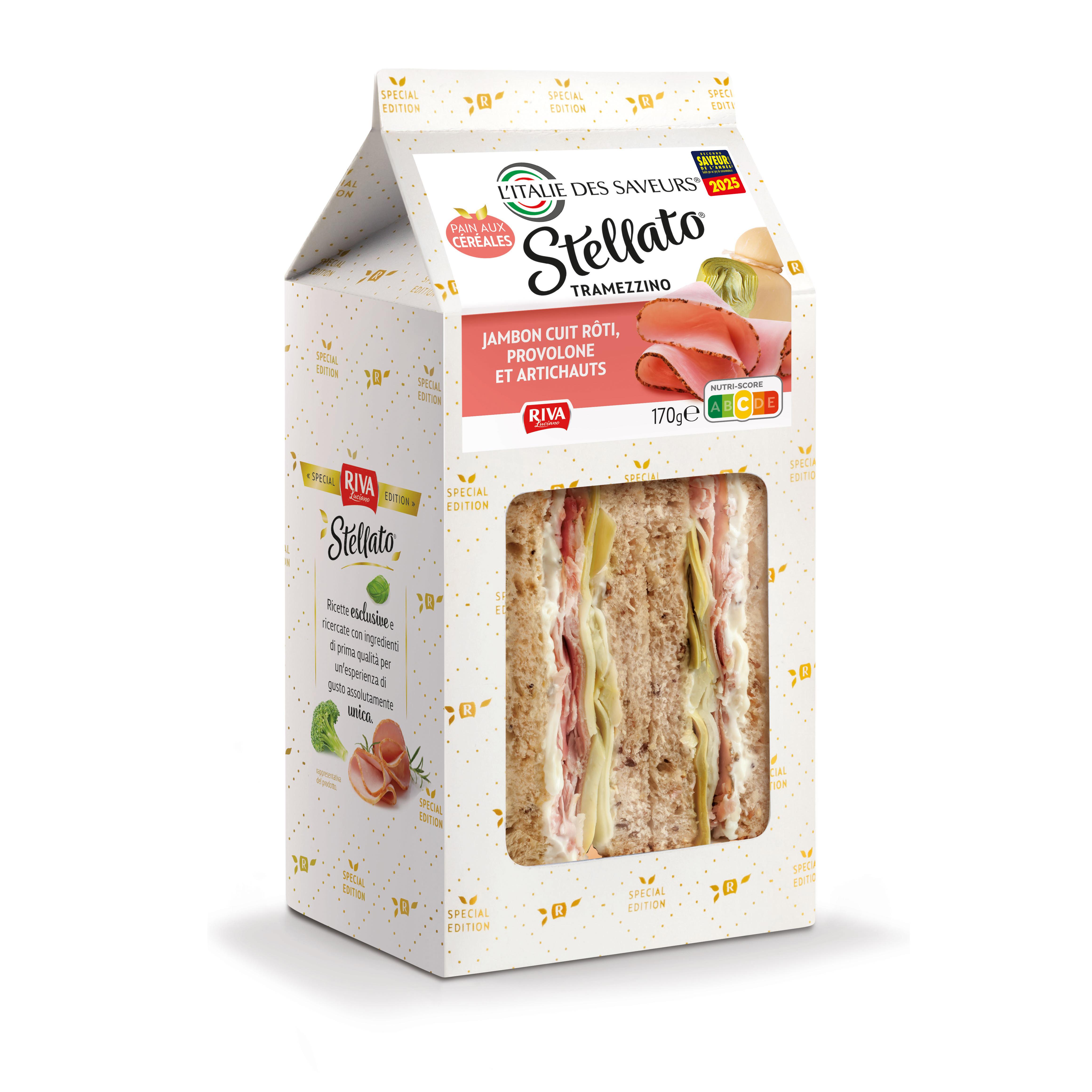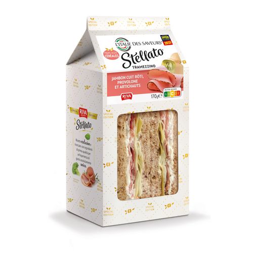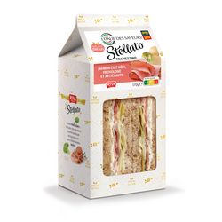 Sandwich au pain aux céréales garni de mayonnaise, jambon cuit rôti, provolone et artichauts 170g