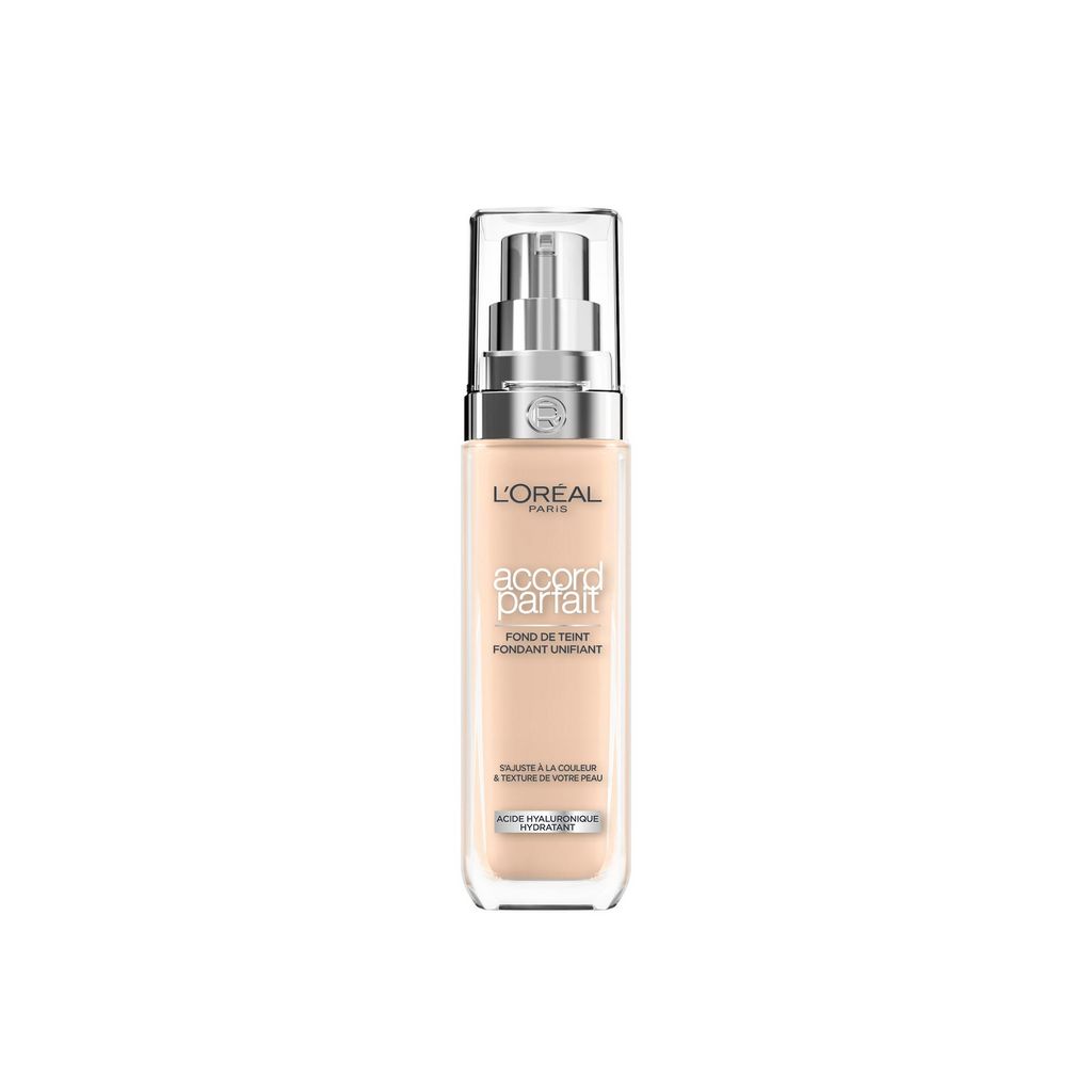 Fond de teint à couvrance naturelle, enrichi en acide hyaluronique et 80% de base hydratante, pour un effet seconde peau. 99,5% des femmes ont trouvé leur accord parfait*. Disponible en 48 teintes. *Test consommateur sur 211 femmes avec 48 teintes Votre Accord Parfait qui vous ressemble. Conçu pour une couvrance naturelle et un résultat non poudreux, et sans démarcation. Pour un maquillage effet seconde peau.
