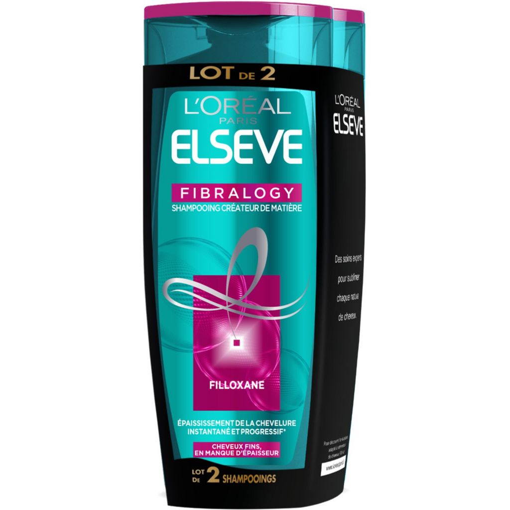 Shampoing pour Cheveux Fins et Sans Volume - Innovation Filloxane - Pénétration Rapide et Action Durable ACTION DURABLE : application après application, la matière créée reste dans la fibre. L'effet d'épaississement est cumulatif, shampooing après shampooing*. *Test instrumental avec shampooing + après-shampooing L'Oréal Paris Elsève Fibralogy Shampoing pour cheveux fins en manque de volume Lot 2 x 250ml 500.0MLT