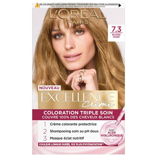Excellence Crème de L'Oréal Paris, enrichi en acide hyaluronique* pour 10X plus d’hydratation** et une couleur riche longue durée. Obtenez une qualité de cheveux visiblement meilleure que sans coloration. Couvre 100% des cheveux blancs*** pour tous les types de cheveux. *Shampooing et masque enrichis en acide hyaluronique **Test instrumental après utilisation du masque nutritif ***Test instrumental Le Kit contient une crème colorante protectrice, un shampooing soin au pH doux et un masque éclat nutritif. Si vous hésitez entre deux nuances, choisissez la teinte la plus clair. Si vous avez les cheveux longs, utilisez deux kits de coloration. Conseil entre deux colorations, camouflez vos racines avec Magic Retouch. Votre couleur est riche et homogène, vos cheveux souples et brillants.
