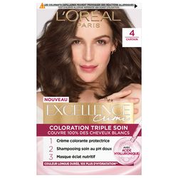 Excellence Crème de L'Oréal Paris, enrichi en acide hyaluronique* pour 10X plus d’hydratation** et une couleur riche longue durée. Obtenez une qualité de cheveux visiblement meilleure que sans coloration. Couvre 100% des cheveux blancs*** pour tous les types de cheveux. *Shampooing et masque enrichis en acide hyaluronique **Test instrumental après utilisation du masque nutritif ***Test instrumental Le Kit contient une crème colorante protectrice, un shampooing soin au pH doux et un masque éclat nutritif. Si vous hésitez entre deux nuances, choisissez la teinte la plus clair. Si vous avez les cheveux longs, utilisez deux kits de coloration. Conseil entre deux colorations, camouflez vos racines avec Magic Retouch. IMPORTANT : La couleur du mélange à l’application a changé, mais le résultat sur vos cheveux reste le même tant que vous ne rincez pas avant les 30 minutes de temps de pose. Votre couleur est riche et homogène, vos cheveux souples et brillants.